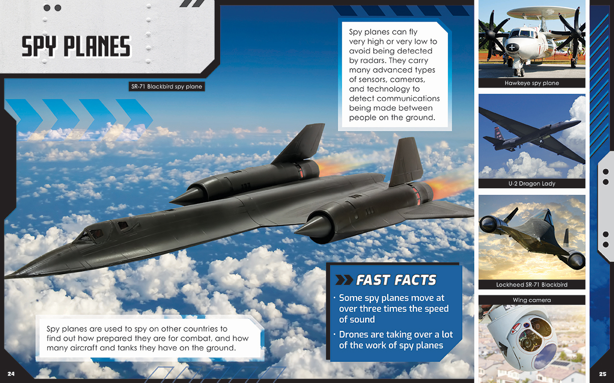 Secret spy planes and supersonic jets fly through this intriguing book.