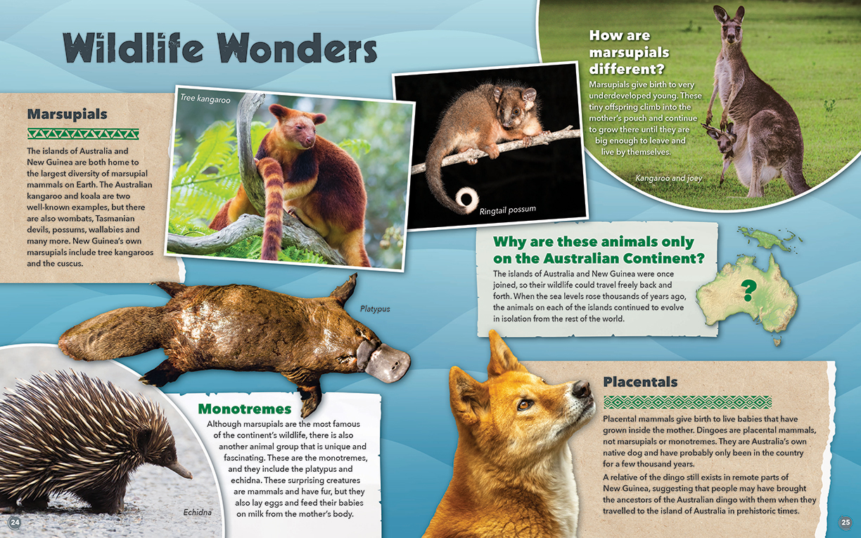 The continent of Australia is not the same as the nation of Australia, which is only a part of the whole continent. The other parts of the continent include the island of New Guinea, as well as a number of smaller islands and the island state of Tasmania. In this book, travel across all these places, and on the way find out about ancient rocks, erupting volcanoes and unique animals.
