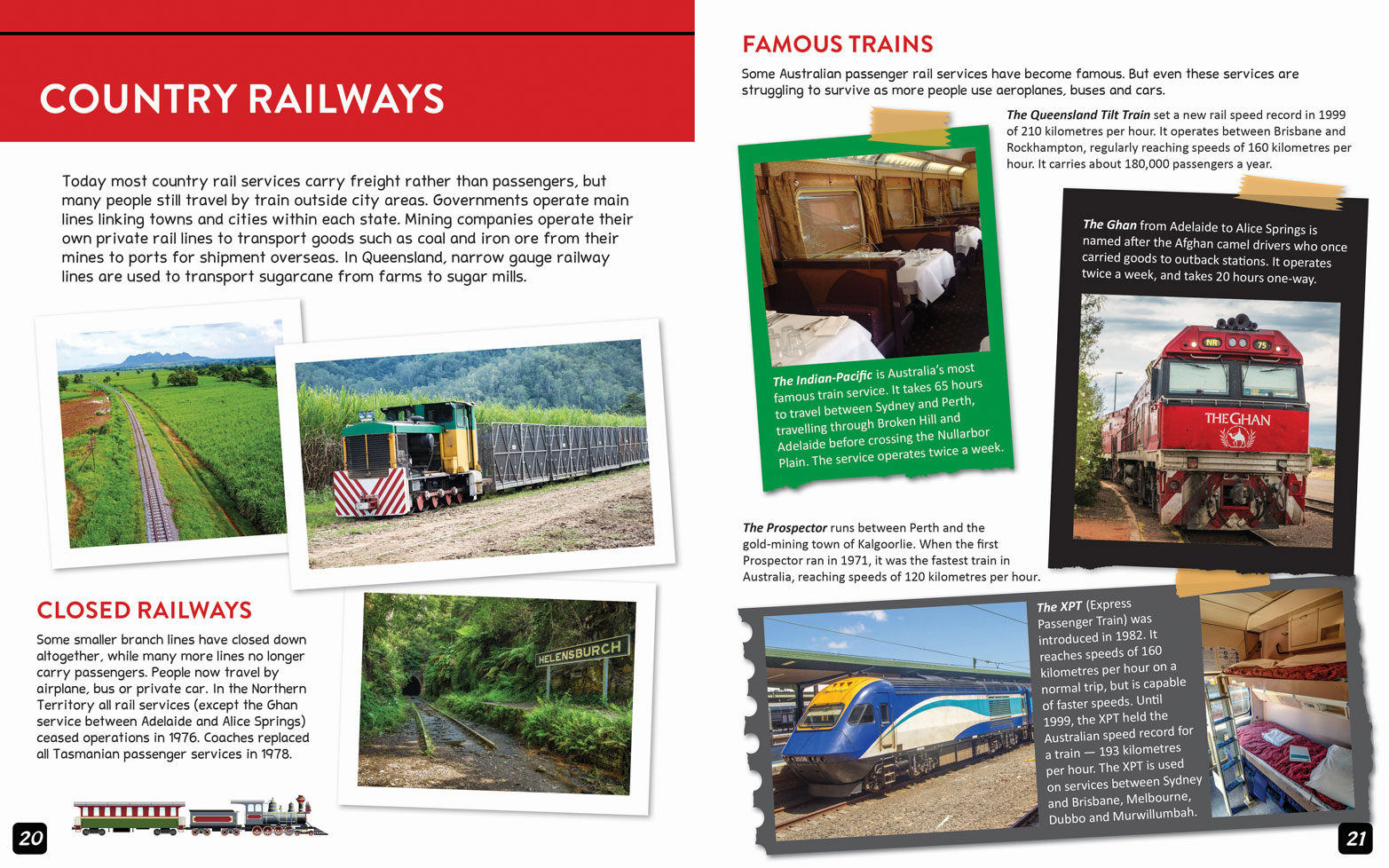 Trains transport freight and people between many cities and towns, and they provide important transport within cities. Read about early rail vehicles in Australia and the different ways they were powered. Find out about the huge job of building railways across the continent. Learn about the jobs people do on trains and at stations today, and what trains might be like in the future.
