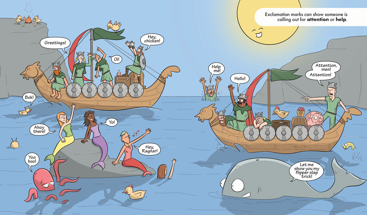 Join a crew of adventurous Vikings as they shout, cheer, and celebrate their way through a wild journey – all while teaching you how and when to use exclamation marks.