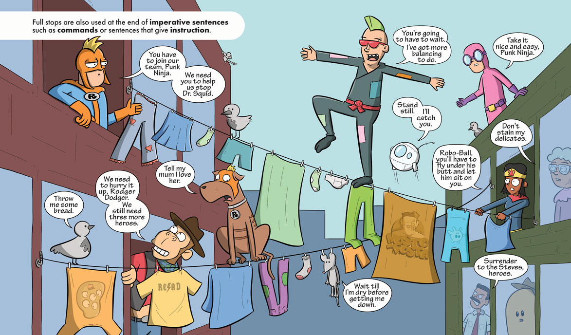 Join Rodger as he travels far and wide, meeting heroes, giving orders, and stopping bad guys – all while showing how full stops help us finish our sentences, share ideas, and know when a story is done.
